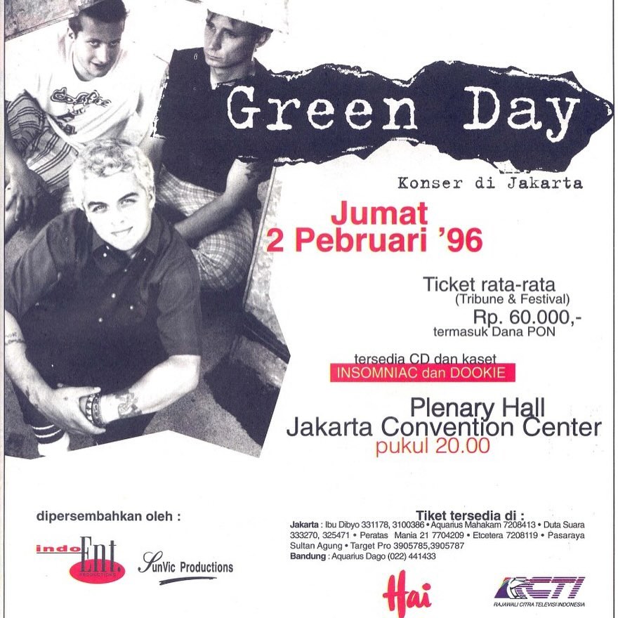 Bertajuk ‘Green Day Konser di Jakarta’, kala itu Billie Joe Armstrong, Mike Dirnt, dan Tré Cool tampil pada 2 Februari 1996. Selama 50 menit, mereka melibas energi punkrockers yang telah memadati Plenary Hall, Jakarta Convention Center (JCC), Senayan, dengan lagu-lagu di album “Insomniac”, dan “Dookie”.