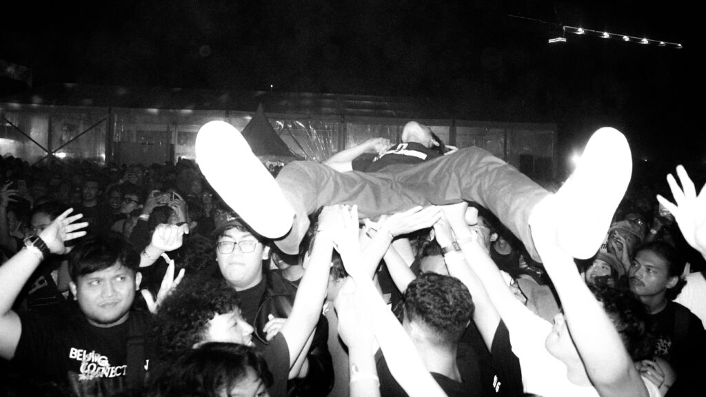 Selanjutnya, dua nomor dari EP Ekstasi giliran dibawakan: “Misteri” dan “Sinyal”. Walau sebagian penonton tampak asing dengan lagu-lagu tersebut, namun euforia tetap terjaga di dalam area moshpit. Sing along mulai terdengar saat “Rasuna” dimainkan, lalu pecah ketika “Kaktus” mengudara. Satu dua orang mulai crowd surfing di lagu ini, dan ramai riuh penonton yang ikut menyanyikan bait demi bait. Termasuk saya yang sepertinya paling kencang berteriak dengan nada sumbang saat penggalan lirik tentang Salemba dinyanyikan.