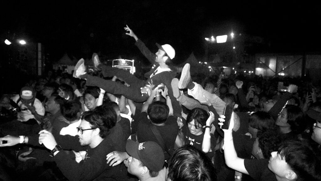 Puncaknya hadir ketika intro gitar “Lari 100” menerobos keluar via tumpukan sound di kiri kanan panggung, disusul dengan rentetan bunyi drum yang seketika menyihir penonton menjadi semakin liar. Beberapa orang merayakan track opus magnum The Sastro ini dengan berlari memutar di tengah moshpit, beberapa lainnya mulai naik dan berlarian di atas panggung. Sesekali ada juga yang merebut mic dan menggantikan Sastro sebagai vokalis. Absurd. Persis gigs DIY di belakang komplek TIM era pertengahan tahun 2000-an. Mentah, chaos, dan penuh energi. Bahkan setelah “Lari 100” usai, beberapa penonton masih enggan turun dari panggung, hingga “Sejati” akhirnya dimainkan sebagai track penutup.